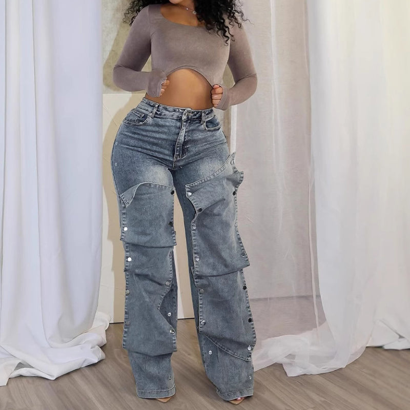 Stylish metal buckles loose jeans